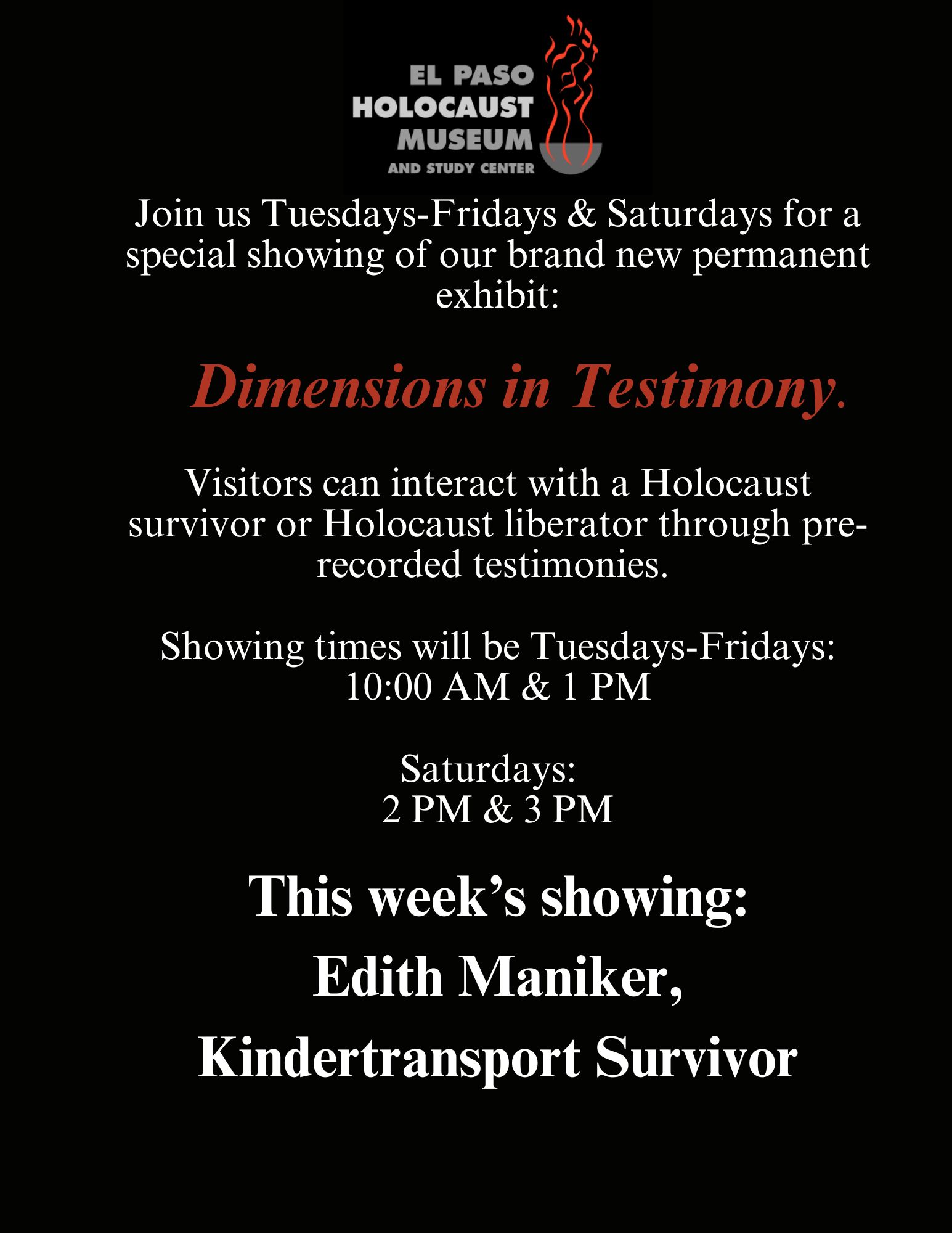Join us Tuesdays-Fridays & Saturdays for a special showing of our brand new permanent exhibit: Dimensions in Testimony