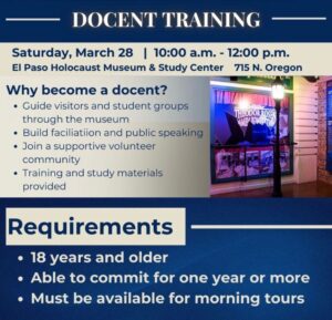 Are you passionate about sharing history and connecting with our community? Join us on March 28th for Docent Training at El Paso Holocaust Museum! Our museum docents play a vital role in guiding vistiors and student groups through the galleries while helping to foster understanding, reflection, and meaningful dialogue about the Holocaust and its lessons for today.