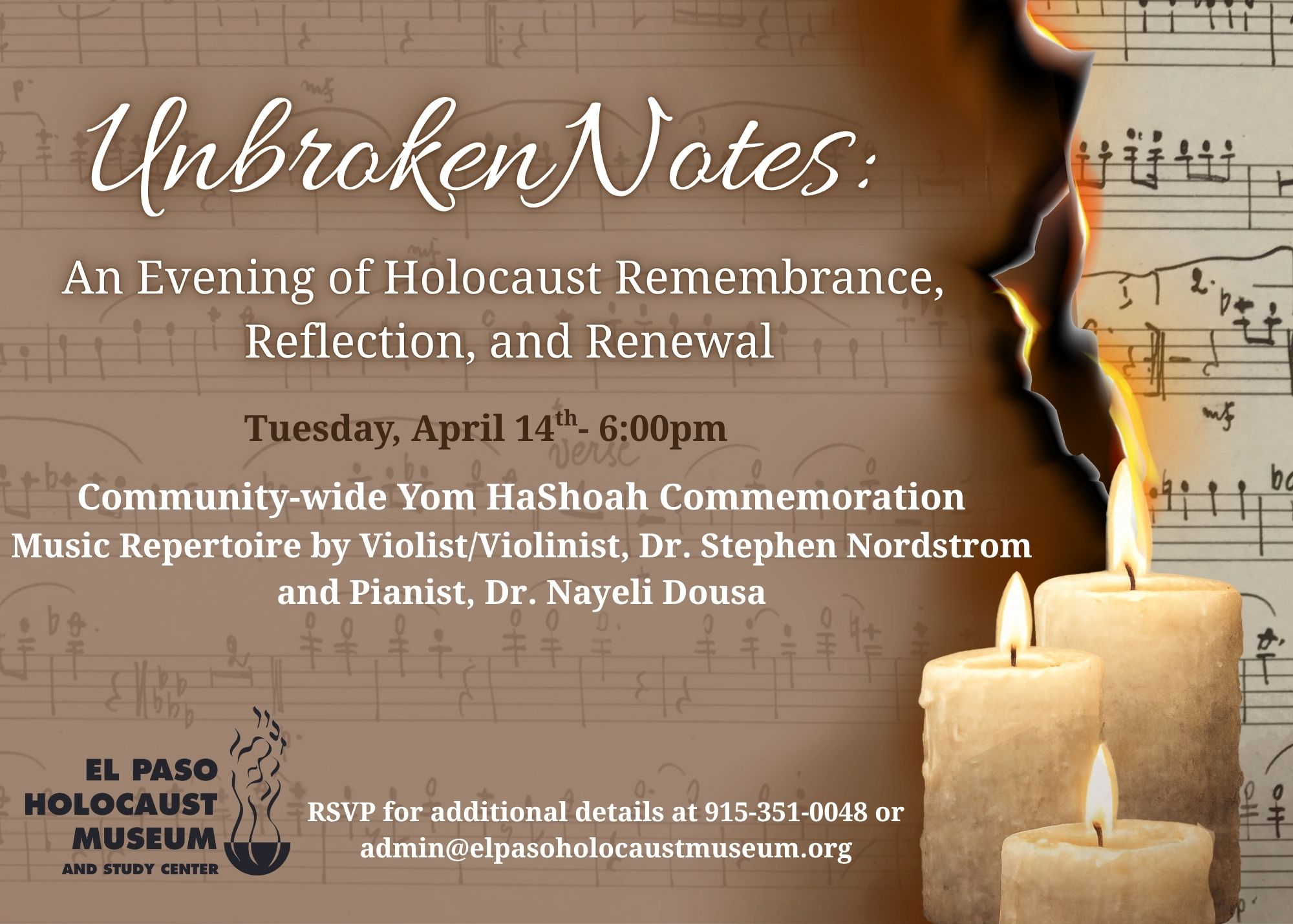 Unbroken Notes: An Evening of Holocaust Rmemberance, Reflection, and Renewal, featuring music by Dr. Stephen Nordstrom and Dr. Nayeli Dousa.